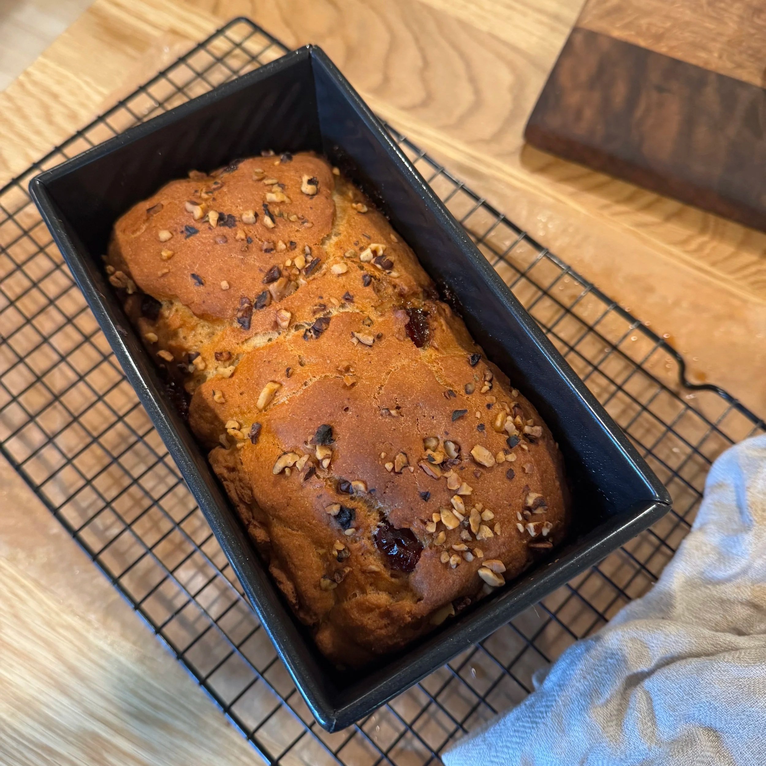 1/2 cup walnuts, briefly toasted if possible (optional). Reserve some for top of loaf if desired.