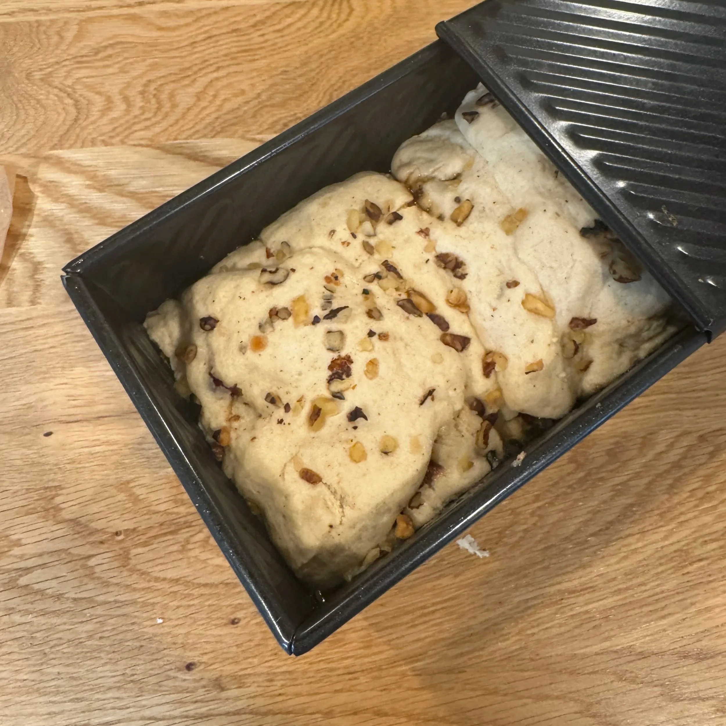Risen loaf will be about 3/4 up the sides of the pan and have a pillowy texture. Add nuts to the top if desired.