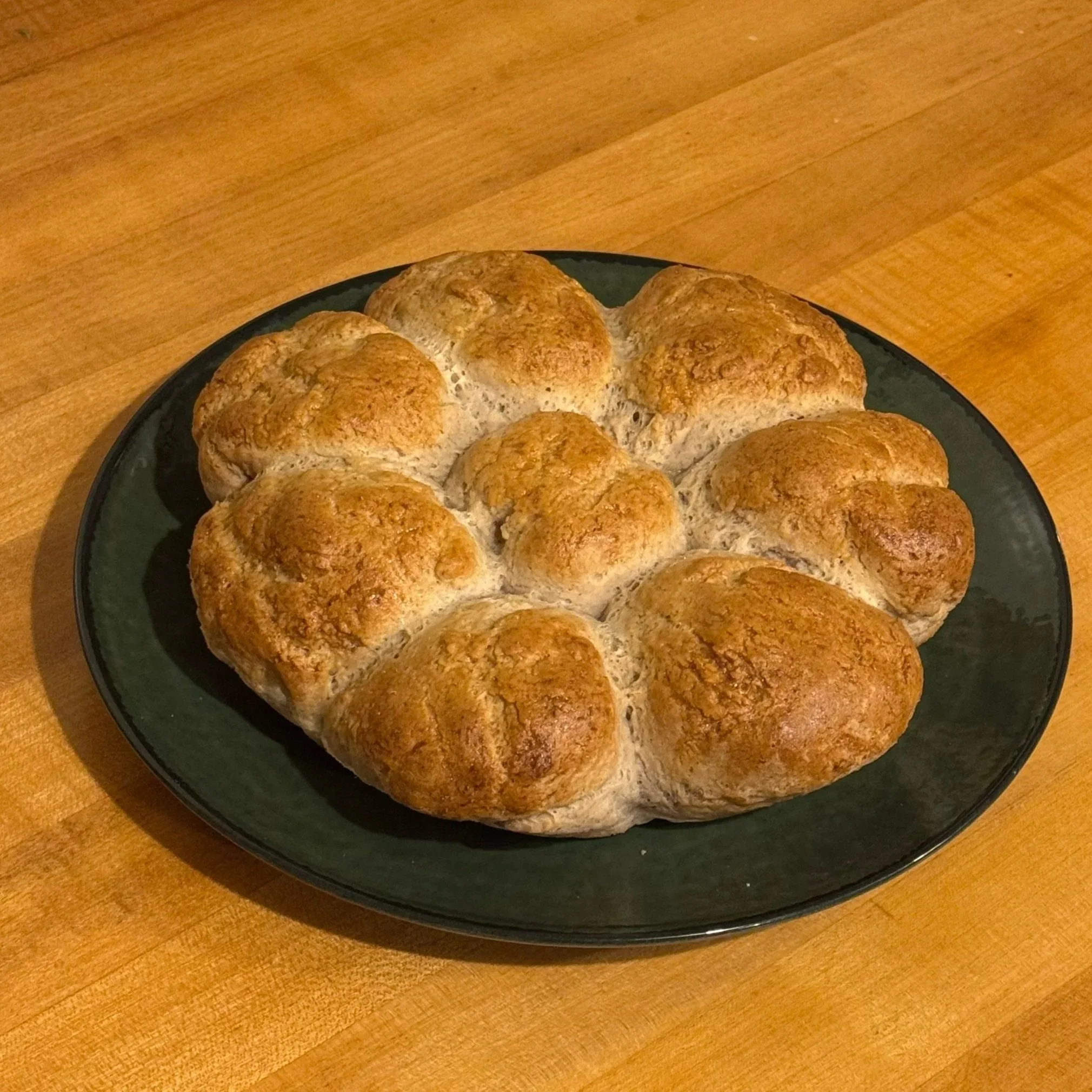 Split dough into about 8 even pieces and roll each piece with wet hands until round and smooth. Add dough balls to pie pan or skillet in a circle, with one in the middle. Cover and leave to rise for 1 hour.