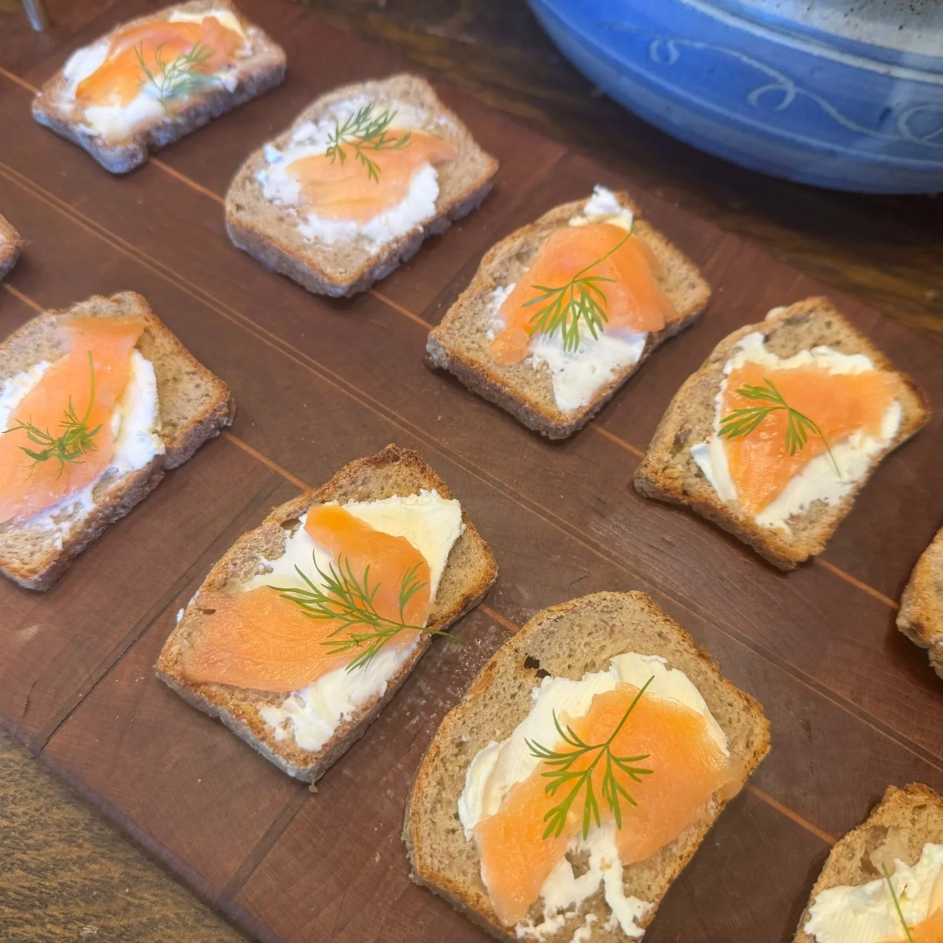 Thinly sliced, gently toasted and served with cream cheese and lox.