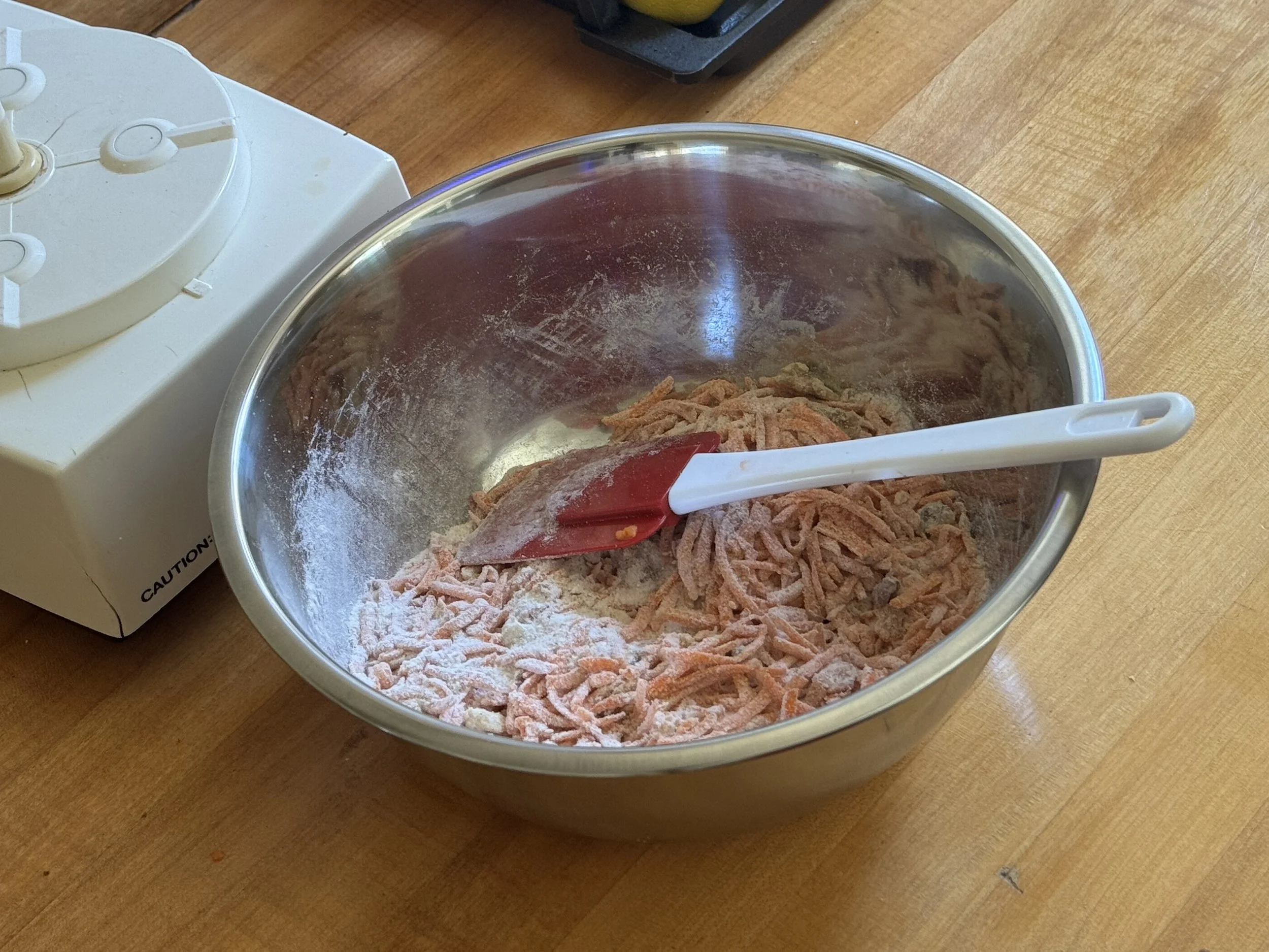 Mix dry ingredients into carrots (and nuts and raisins, if using)
