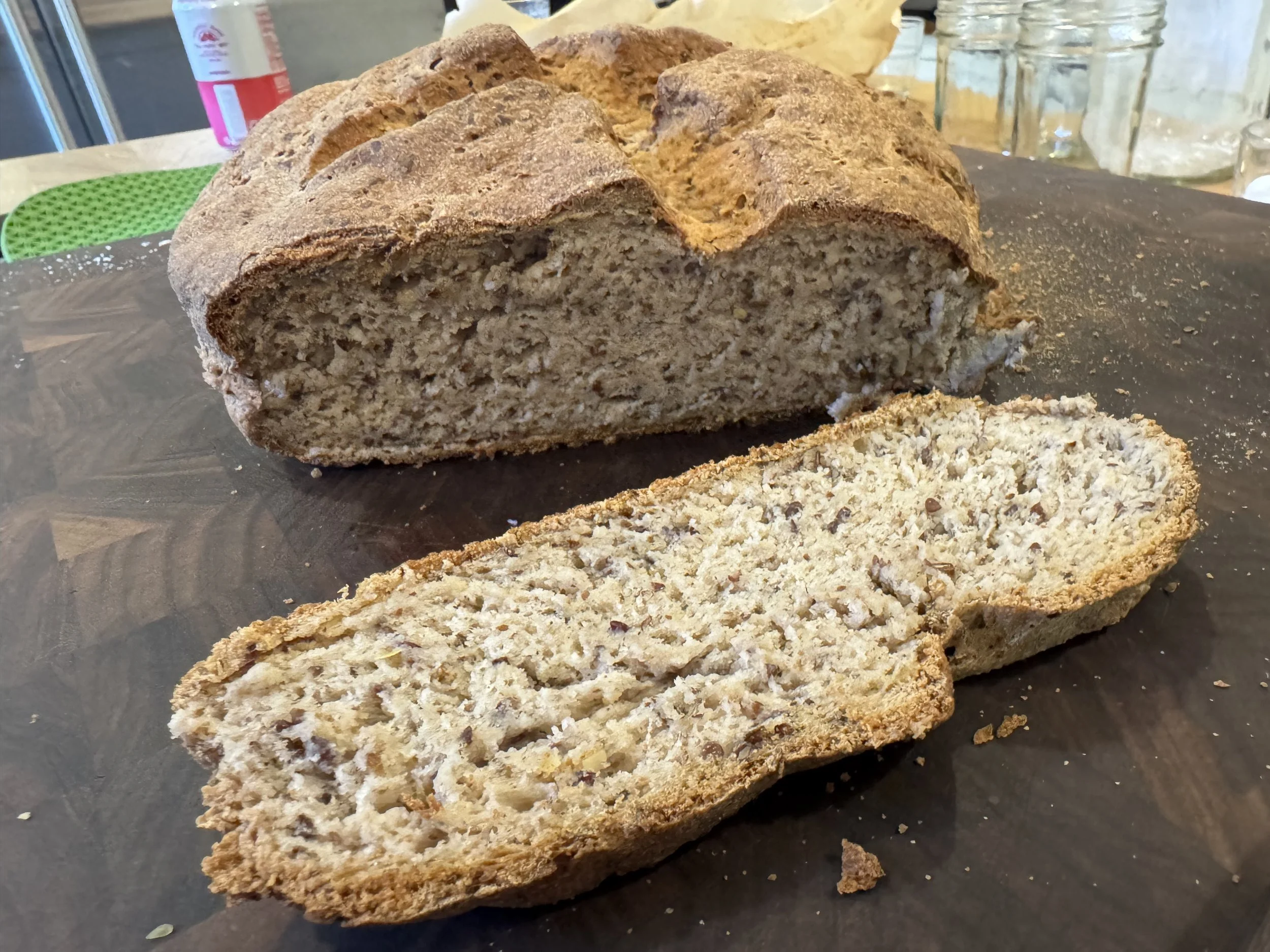 Shape dough into a ball with wet hands and place on a piece of oiled parchment and place into 8” skillet or pie pan. Slice a 3-4” long “X” into the top of the dough with a sharp knife, sprinkle with a few teaspoons of water, cover lightly with a clean towel and leave to rise for about 2 hours.