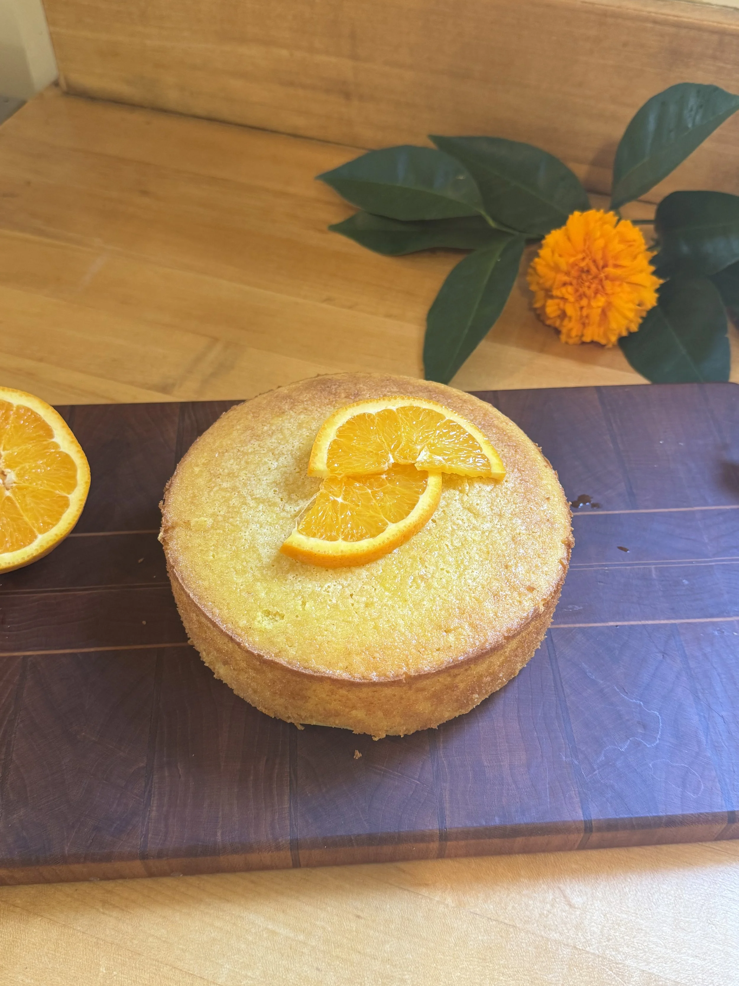 Pour batter into 6” greased cake pan and bake at 325°F for 35 minutes, until center is set and sides are starting to pull away from pan.