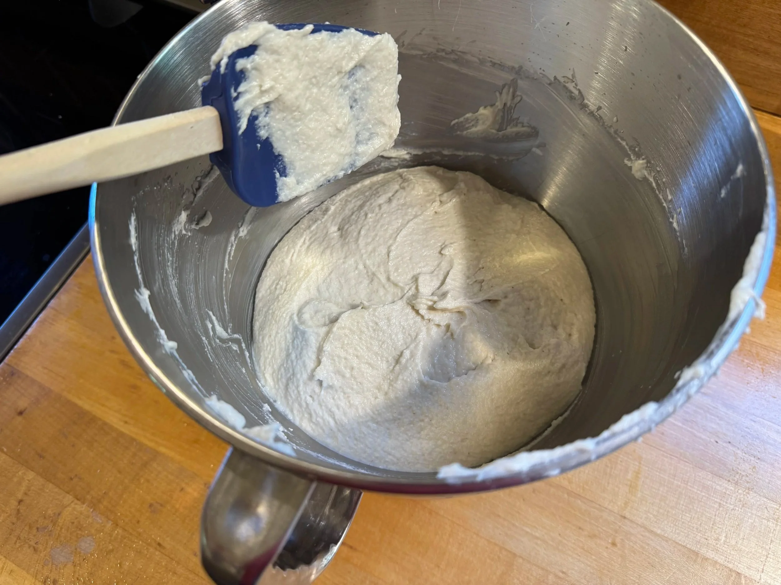 Once liquid is incorporated, turn mixer up to medium high speed and mix for 5 minutes. Dough will be more like a batter than a glutenous pizza dough. Scrape sides of bowl, consolidate dough at the bottom of the mixing bowl and cover bowl with a clean cloth (keeping it at the top of the bowl to prevent sticking to the dough).